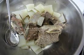 냄비에 새 물 3.5L를 붓고 데친 갈비를 넣습니다. 여기에 마늘, 양파, 통후추를 함께 넣어 약불에서 끓이기 시작합니다. 처음에는 센 불, 끓기 시작하면 바로 약불로 줄여주세요.