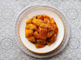 그릇에 담아 통깨를 솔솔 뿌리고 대파 초록 부분을 조금 올리면 보기에도 먹음직스러워요 상에 올리기 전에 한 조각을 잘라보아 단면이 촉촉한지 확인하고 필요하면 팬에 남은 소스를 한 숟가락 떠서 위에 살짝 더 끼얹어 광택을 보정하세요
