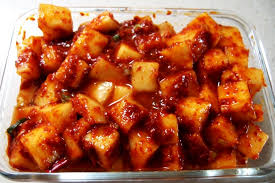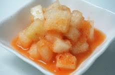 깍두기에 배를 잘게 썰어 넣으면 단맛이 더 풍부해지고 김치 특유의 알싸한 맛이 순해집니다. 멸치액젓 대신 까나리액젓을 사용하면 감칠맛이 부드러워요.