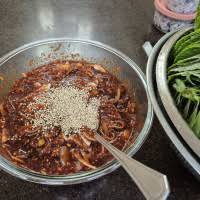 불려 둔 고춧가루에 액젓 간장 매실청 설탕 마늘 생강을 넣고 고루 섞은 뒤 참기름 깨를 넣어 마무리해요. 점성은 숟가락으로 떠서 떨어뜨렸을 때 천천히 흐르는 정도가 좋아요. 너무 되면 잎에 뭉텅 붙고 너무 묽으면 스며만 들어 표면이 휑해져요.