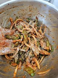 찢은 도라지에 소금을 넣고 손으로 꾹꾹 주물러 주세요. 이 과정에서 도라지에서 거품과 수분이 나오는데, 이것이 쓴맛의 원인이에요. 최소 3분 이상 주물러야 효과가 확실합니다.