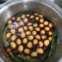 양념 국물이 어느 정도 끓어 향이 올라오면 껍질을 벗겨 놓은 메추리알을 조심스럽게 냄비에 넣어 주세요.