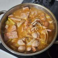 센 불에서 한 번 끓어오르면 중불로 줄이고 10분간 끓입니다. 이때 김치가 충분히 익고, 햄과 소시지에서 기름이 나와 국물에 고소한 감칠맛을 더합니다.