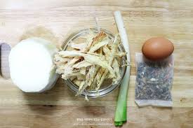 너무 오래 불리면 향이 약해지고 질겨질 수 있어요. 무는 0.5cm 두께로 납작하게 썰어 단맛을 내고, 대파는 어슷 썰어 향을 더합니다. 달걀은 풀어두되 소금 약간만 넣어 간을 미리 해두면 비린내 없이 부드럽게 풀려요 🥚