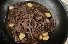 냄비에 육수 2컵을 남겨두고 나머지 양념장과 찢은 고기를 넣어요. 중불에서 끓이기 시작하면 간장이 점점 졸아들며 윤기가 생깁니다.