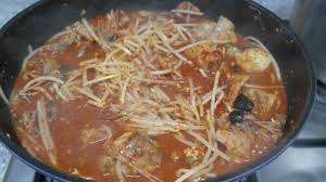 바닥이 눌지 않도록 주걱으로 넓게 펴 주고, 소스가 끓기 시작하면 아귀를 넣을 준비를 합니다. 소스가 팬 전체에 얇게 퍼져 있어야 고르게 코팅됩니다.