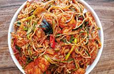 이때 팬을 흔들어 전체를 고르게 섞고, 젓가락질은 최소화해야 아귀살이 완벽한 형태를 유지합니다.