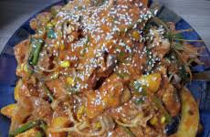 마지막으로 소스 한두 숟가락을 위에서 돌려 끼얹으면 식당 같은 비주얼 완성입니다.