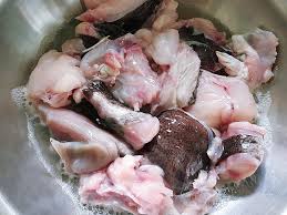 큰 냄비에 물을 팔팔 끓이고 생강 몇 조각과 맛술 1큰술을 넣어 향을 올립니다. 아귀를 넣고 1분만 데친 뒤 바로 건져 찬물로 헹궈 표면의 단백질 찌꺼기와 남은 핏물을 제거하세요.