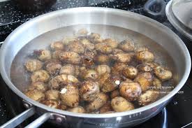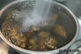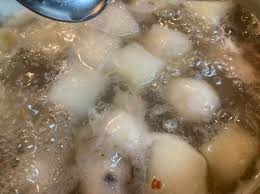 물이 끓기 시작하면 중불로 줄이고 약 십분 정도만 삶아 주세요. 완전히 익힐 필요는 없고 겉껍질만 살짝 말랑해질 정도면 충분합니다.